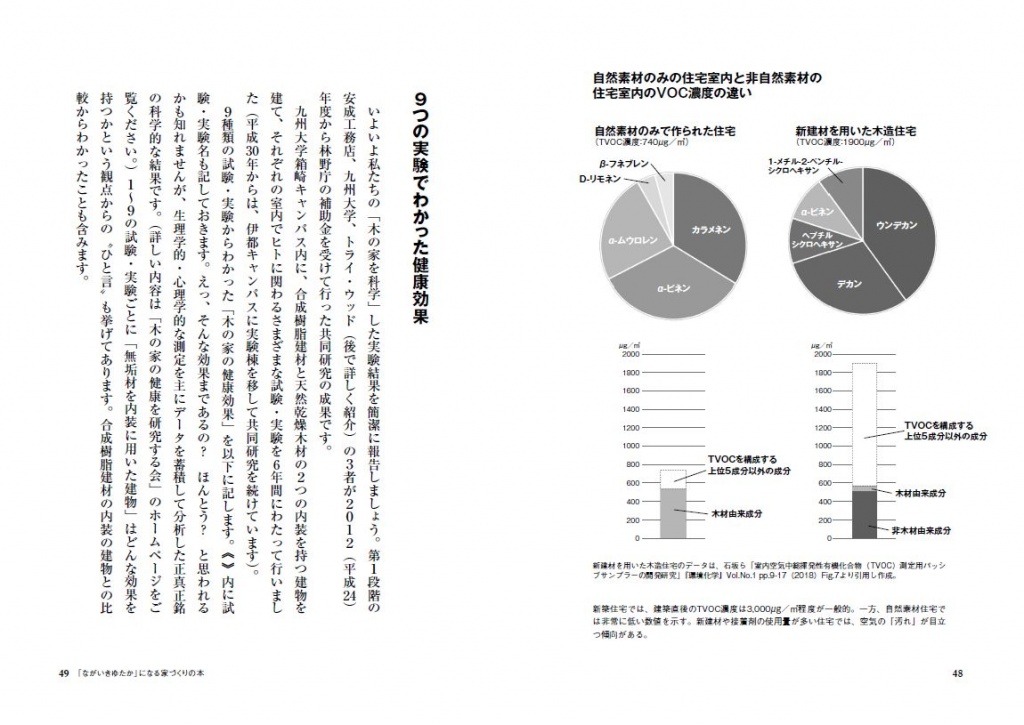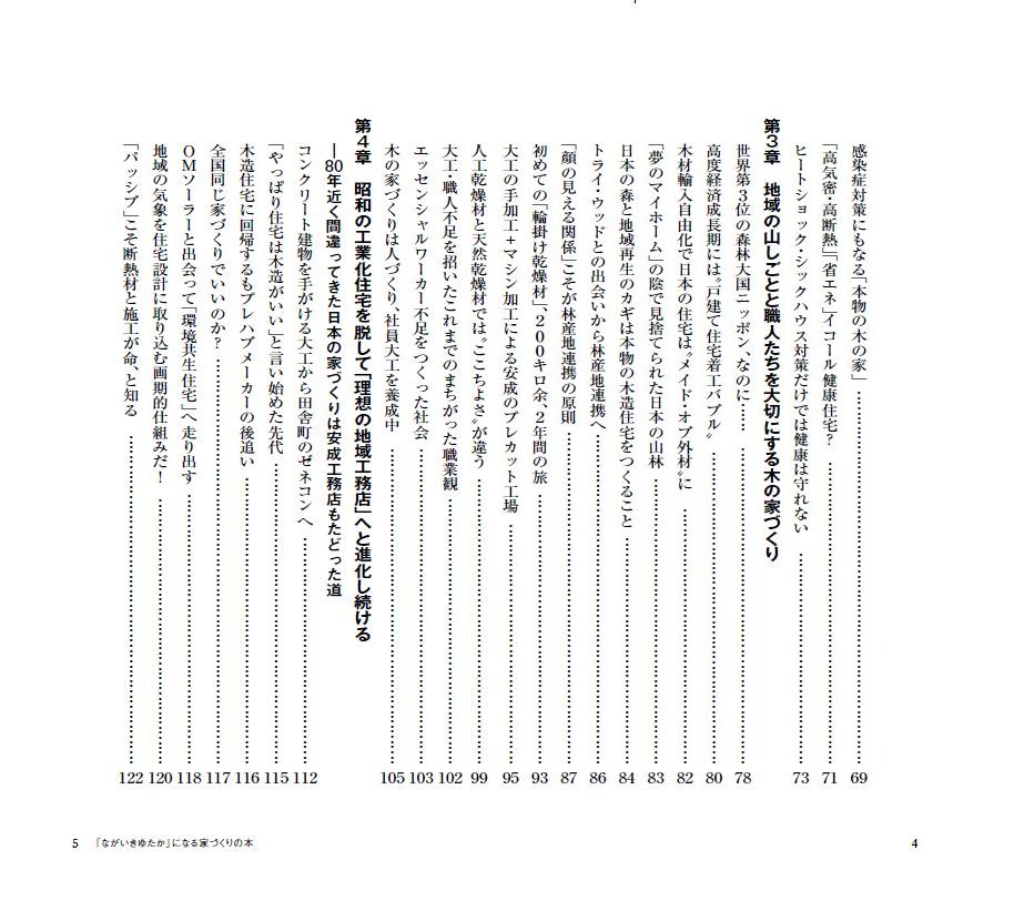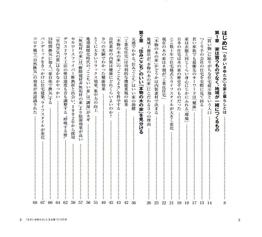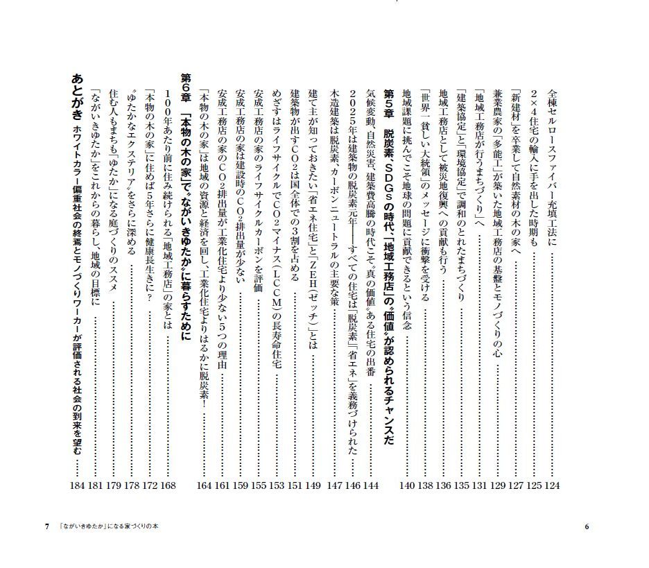 本書では、自然素材の住まいがもたらす健康への効果、国産材活用による森と地域の循環、脱炭素時代に求められる長寿命住宅、そして地域工務店の果たす役割などについて、これまでの経験と実例を交えながら綴っています。